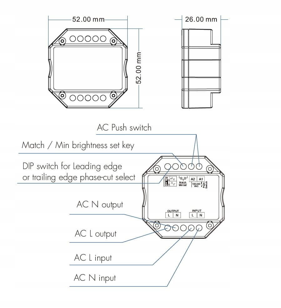 - ✔️ Tryby pracy – możliwość wyboru ściemniania fazowego (leading edge / trailing edge)