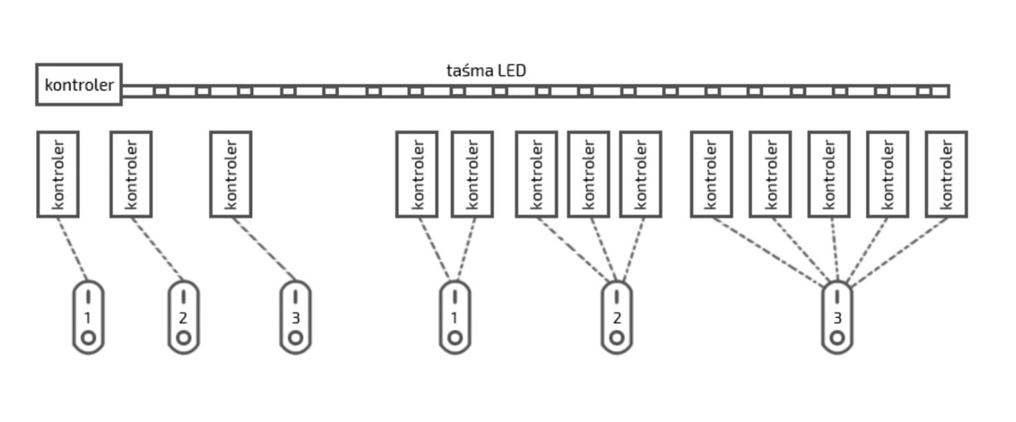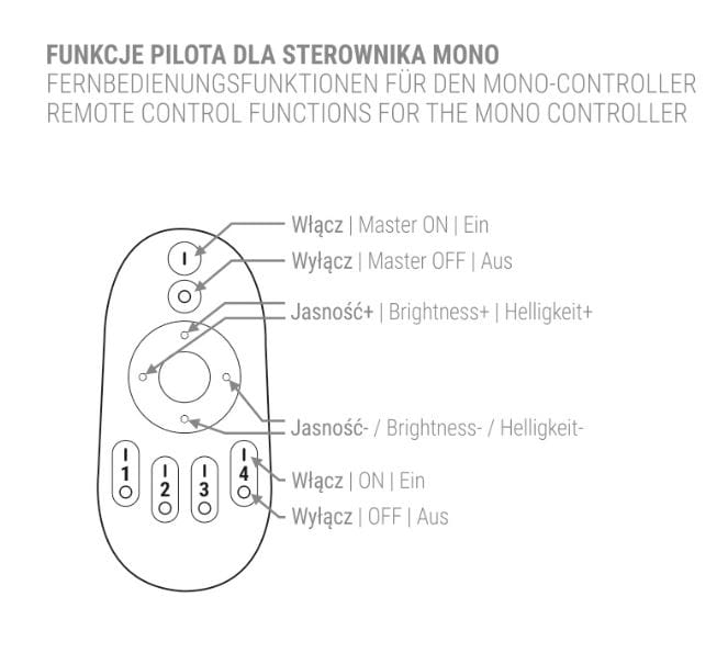 - Indywidualne sterowanie każdą z 4 stref oświetlenia (do każdej strefy można przypisać dowolną liczbę odbiorników Mi-Light)
