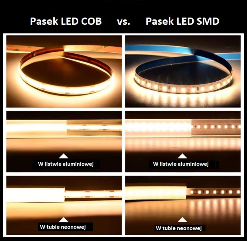 Taśmy LED COB to najnowsze rozwiązanie w zakresie oświetlenia liniowego. Zdecydowaną zaletą jest uzyskanie jednolitej linii światła z samej taśmy bez użycia dodatkowych akcesoriów, takich jak profile do taśm z mlecznym kloszem rozpraszającym światło. Taśmy COB pozwalają na formowanie i składanie ich w dowolnym kształcie. Charakteryzują się wszechstronnym i uniwersalnym zastosowaniem.