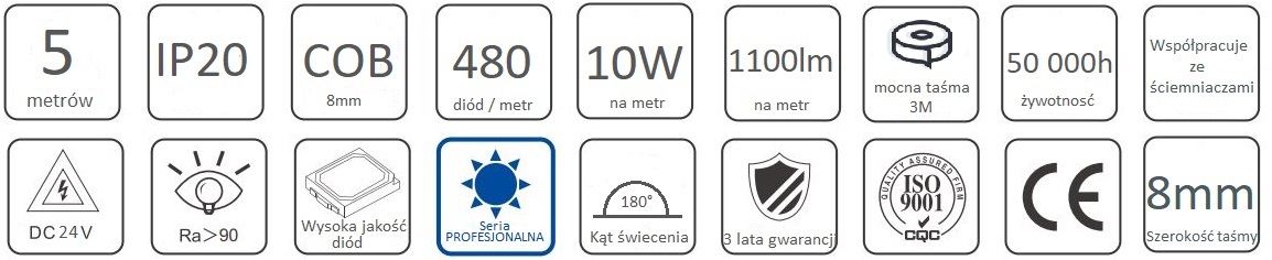 - Moc: 10W/m (zalecana moc zasilacza min. 50W)