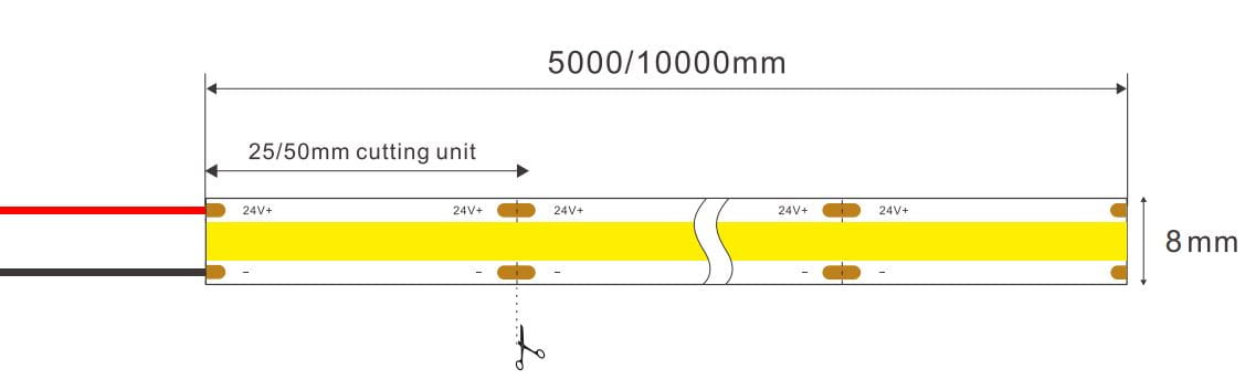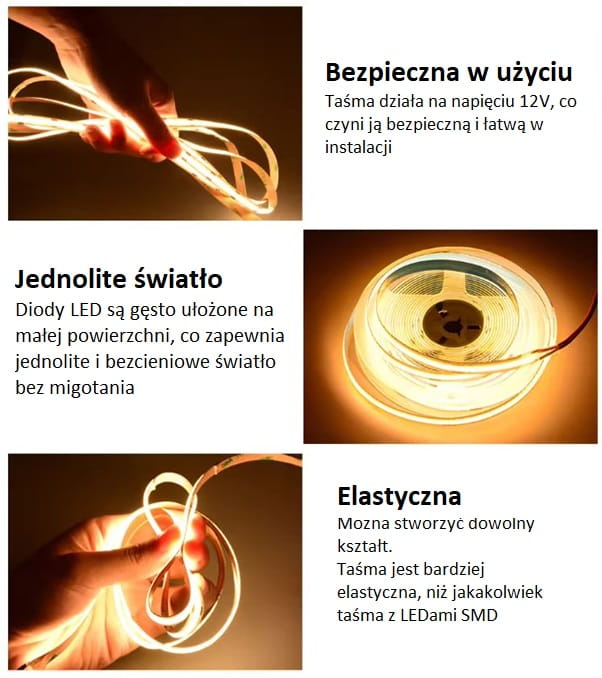 Taśmy LED COB to najnowsze rozwiązanie w zakresie oświetlenia liniowego. Zdecydowaną zaletą jest uzyskanie jednolitej linii światła z samej taśmy bez użycia dodatkowych akcesoriów, takich jak profile do taśm z mlecznym kloszem rozpraszającym światło. Taśmy COB pozwalają na formowanie i składanie ich w dowolnym kształcie. Charakteryzują się wszechstronnym i uniwersalnym zastosowaniem.