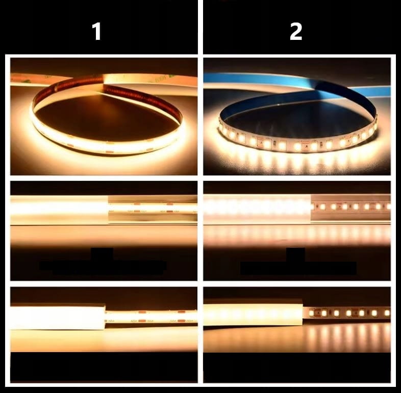 Zdjęcie numer 1 przedstawia działanie sprzedawanej taśmy COB, Zdjęcie numer 2 przedstawia standardowy typ taśmy SMD