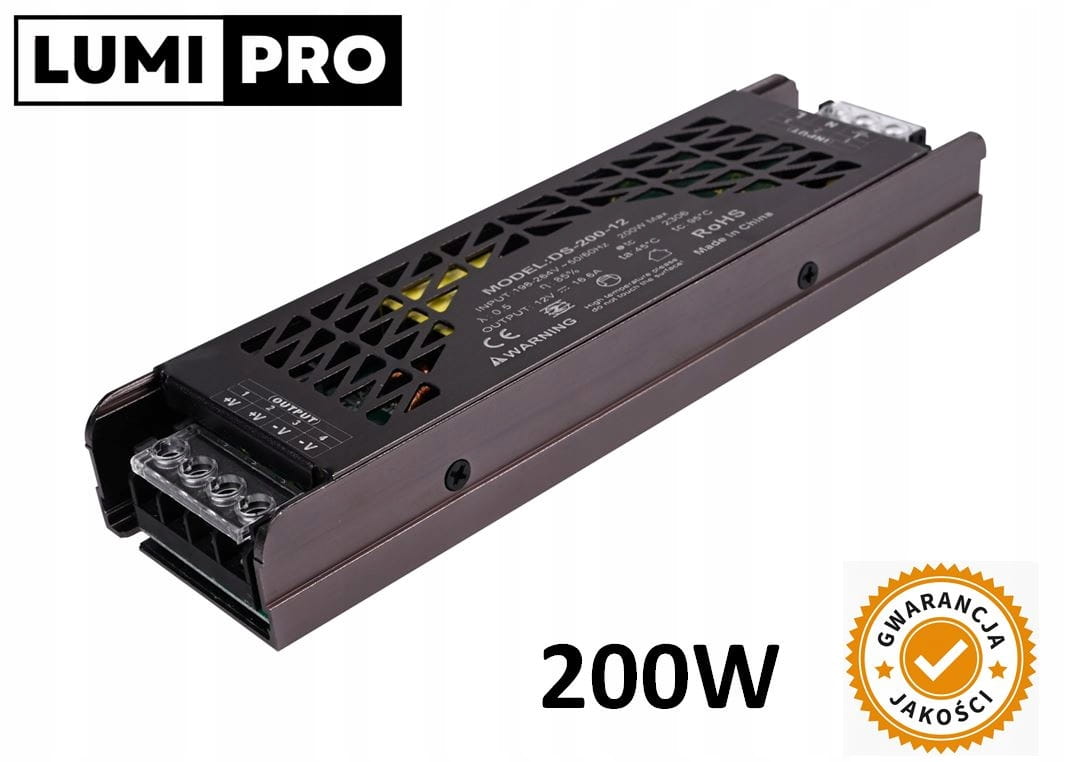 Zasilacz 12V o mocy 200W 16,7A IP20 PREMIUM (podwyższona jakość) Model: Lumi Pro DS-200-12