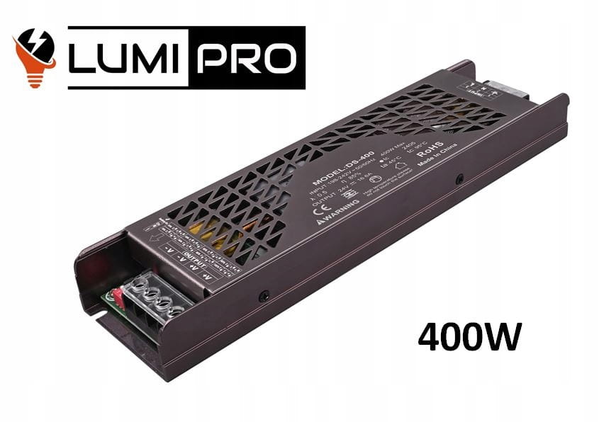 Zasilacz 12V o mocy 400W 33,3A IP20 PREMIUM (podwyższona jakość) Model: Lumi Pro DS-400-12 z możliwością ustawienia natężenia światła oraz możliwością włączenia tzw. miękkiego startu.