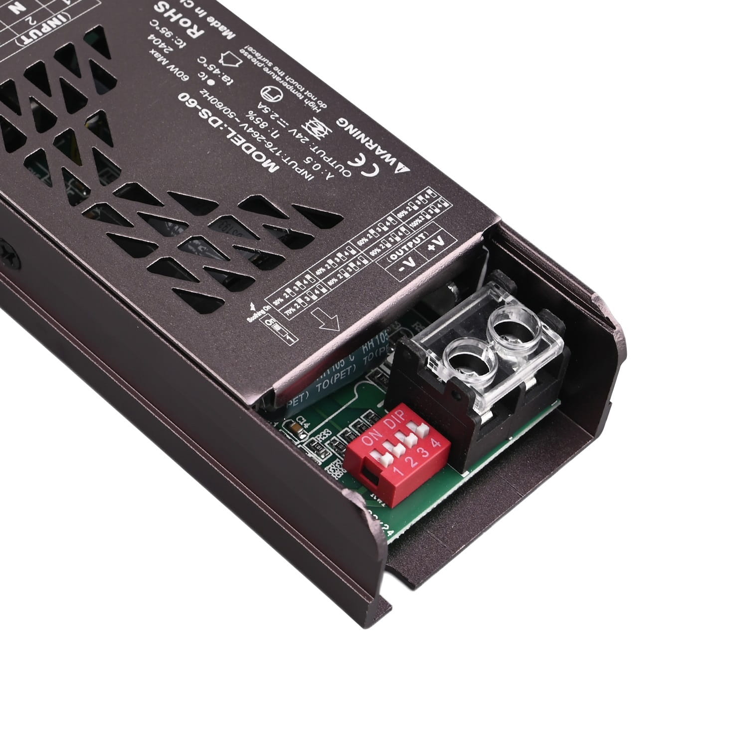 2) Za pomocą przełączników od 2 do 3 można ustawić natężenie światła zgodnie ze schematem widocznym na zasilaczu (aż 8 programów 30%, 40%, 60%, 60%, 70%, 80%, 90%, 100%)
