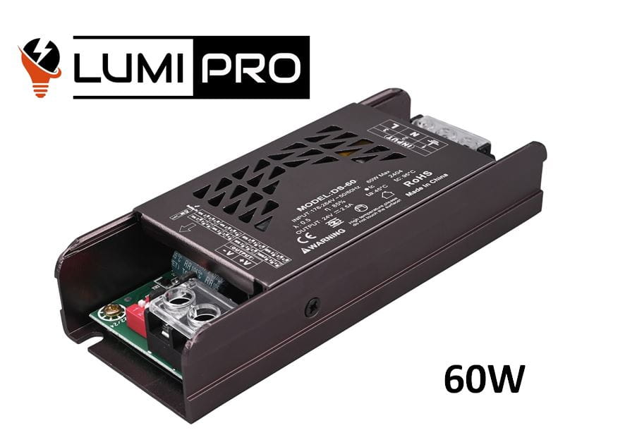 Zasilacz 12V o mocy 60W 5A IP20 PREMIUM (podwyższona jakość) Model: Lumi Pro DS-60-12 z możliwością ustawienia natężenia światła oraz możliwością włączenia tzw. miękkiego startu.