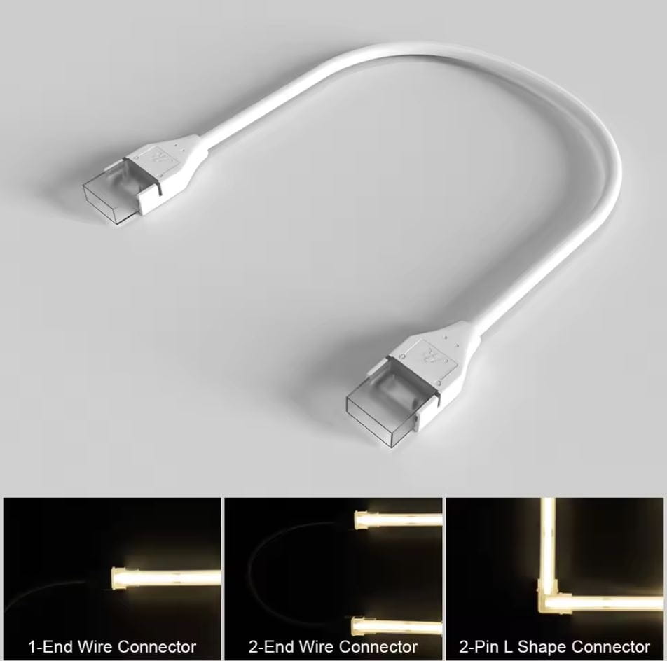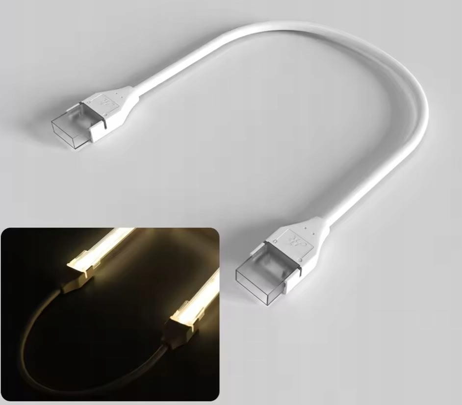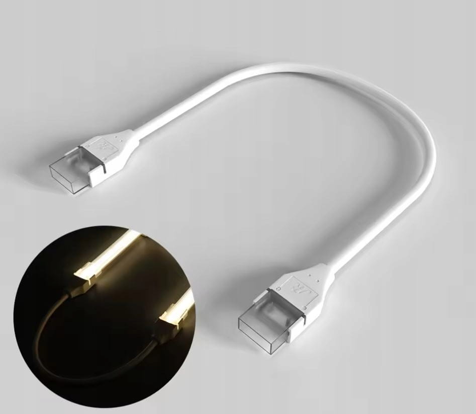 Przedmiotem aukcji jest wysokiej jakości złączka z kablem 17cm do połączenia dwóch taśm 8mm podkład (10mm z osłonną silikonową) LED COB i typu 2835 (240 led) IP67. W celu uzyskania wodoszczelności przezroczystą część złączki należy wypełnić klejem lub silikonem (brak w zestawie).